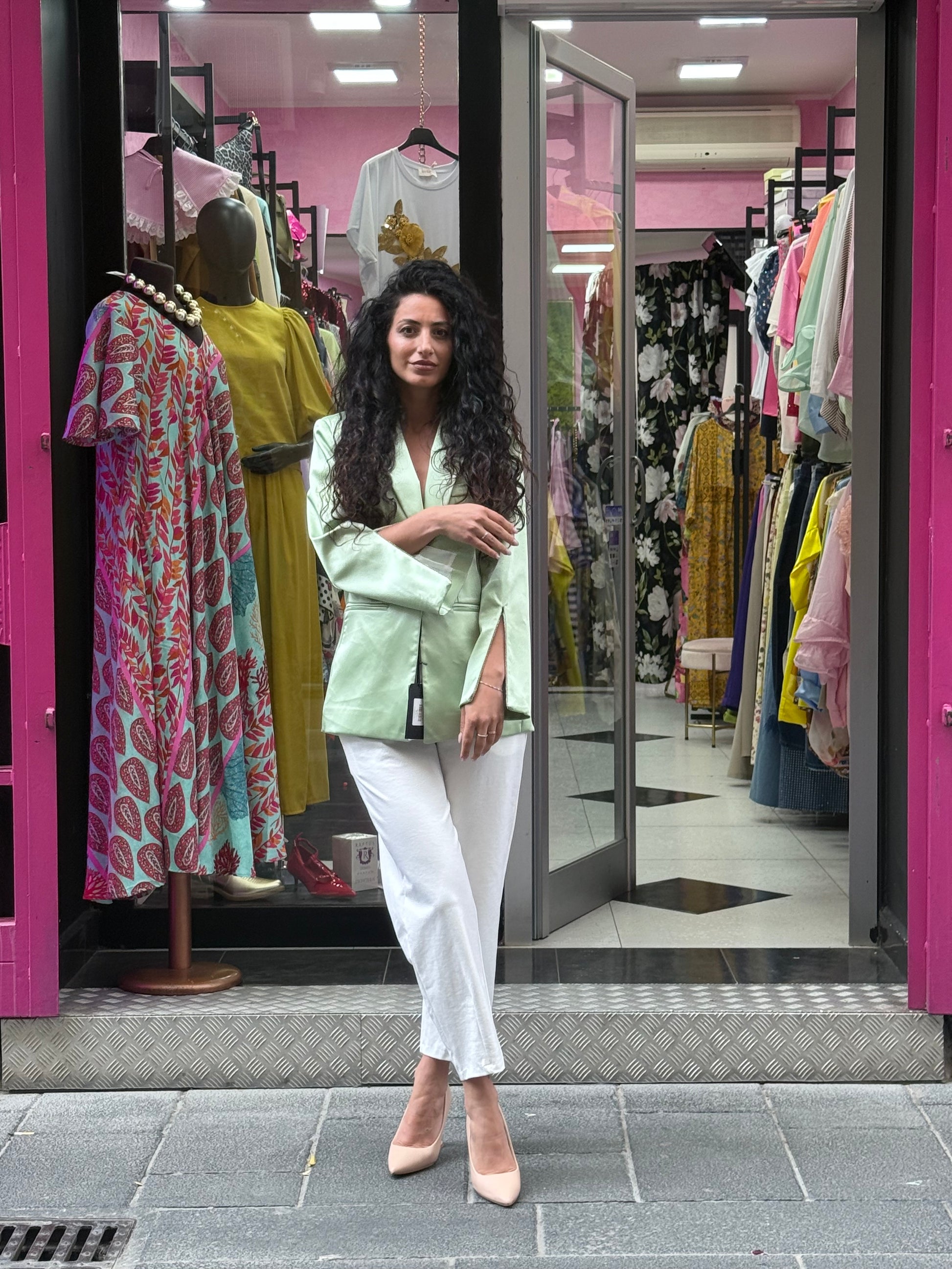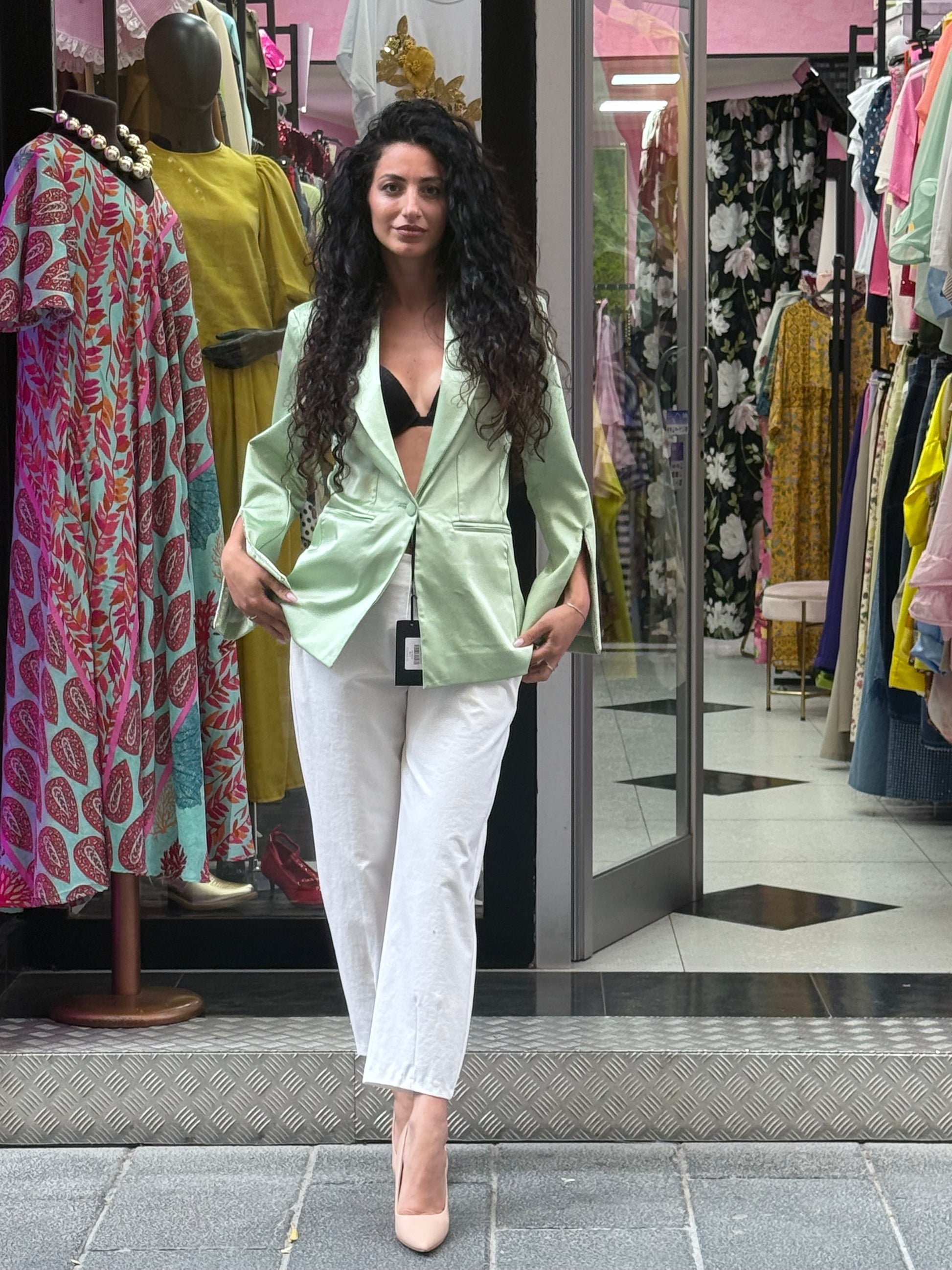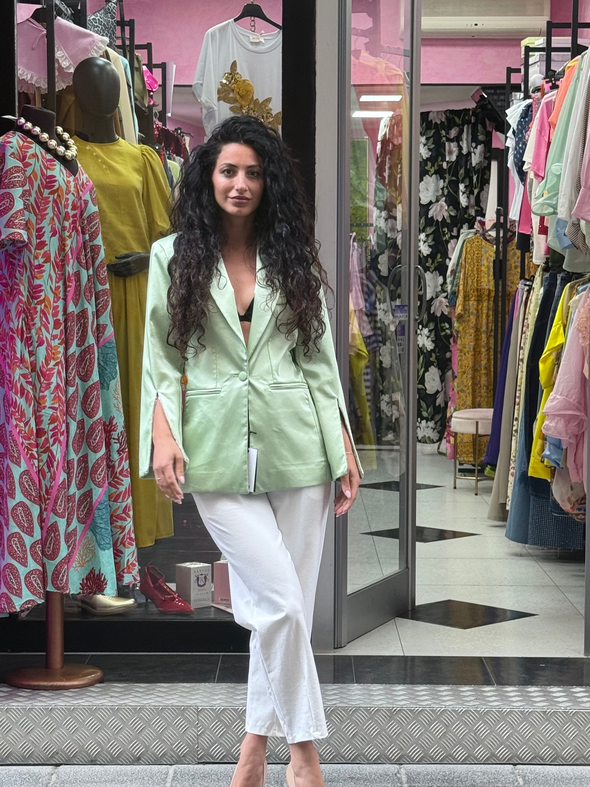 Questo blazer mono petto di Elle By lumina è disponibile in diverse taglie ed è realizzato in raso per un look elegante. Il dettaglio spacco manica è arricchito da bellissimi strass, aggiungendo un tocco di luce al tuo outfit. Perfetto per un look sofisticato e raffinato.