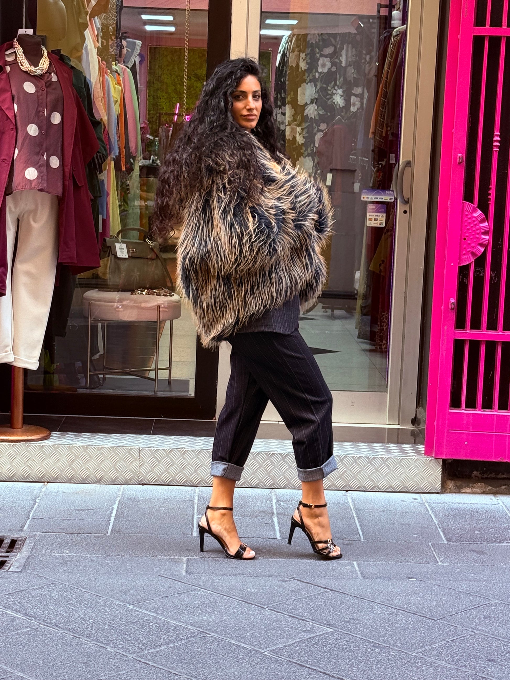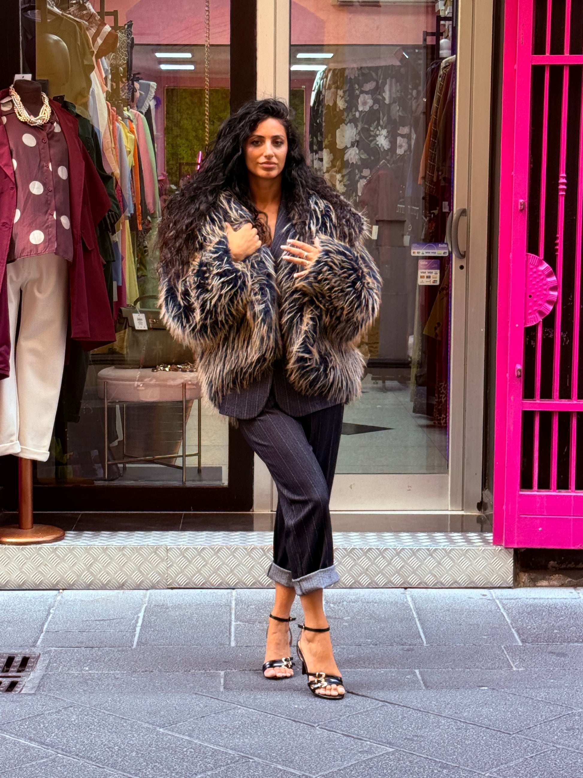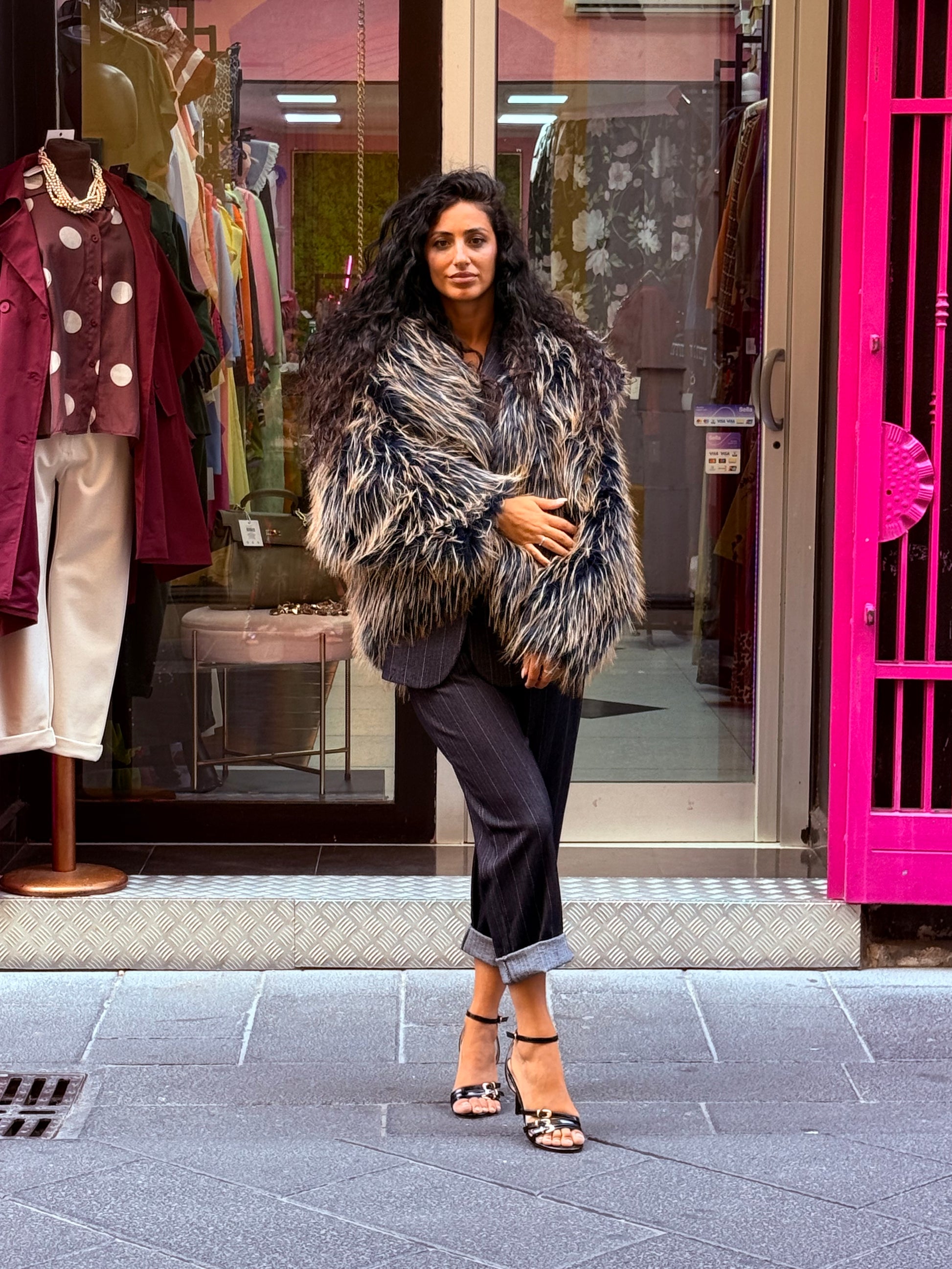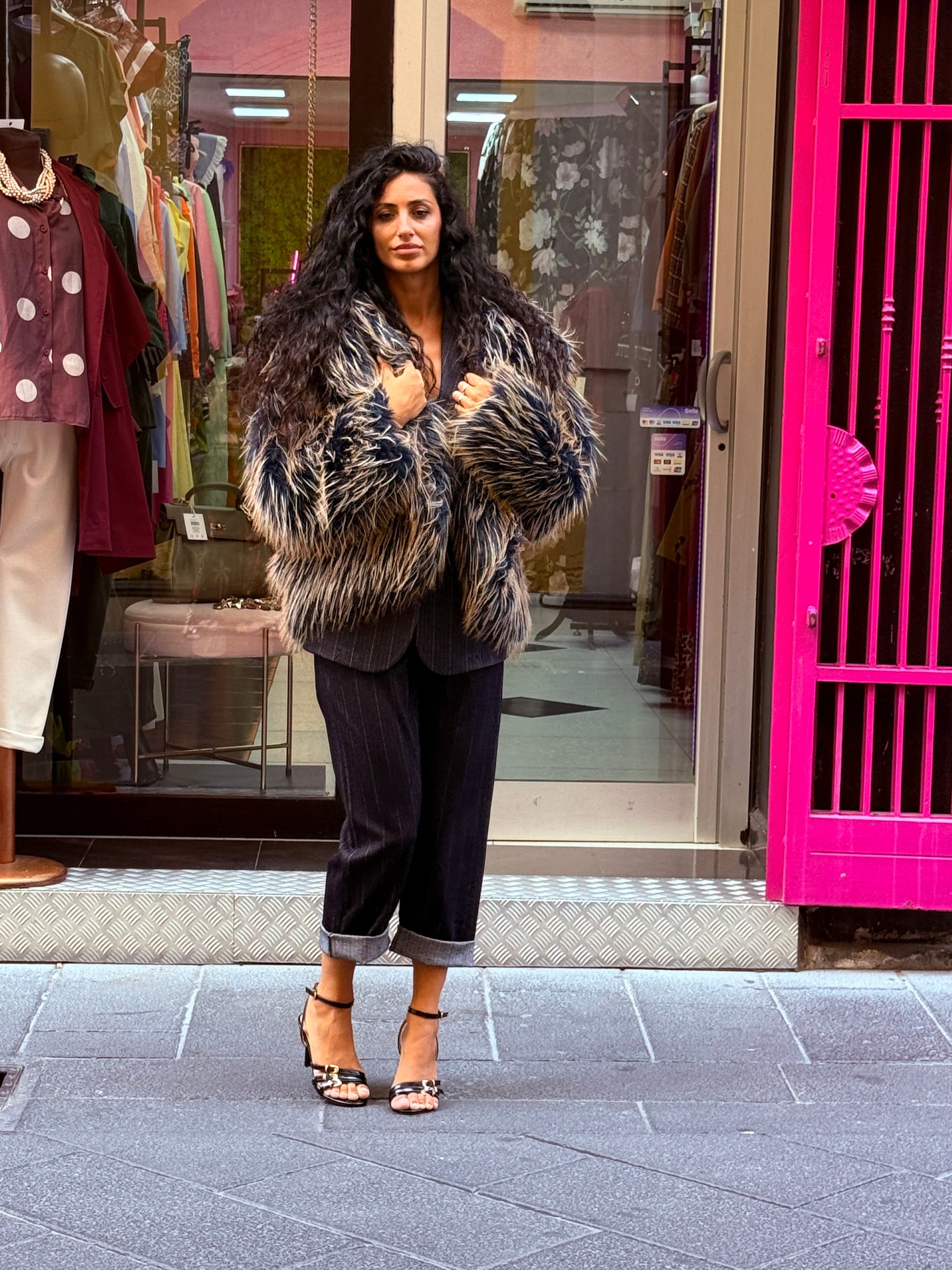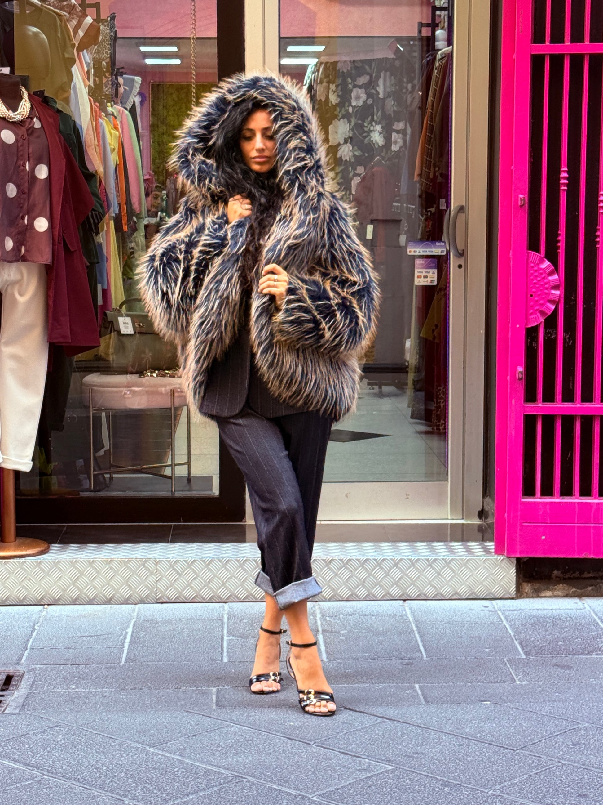 Eco pelliccia con cappuccio taglia unica veste over modello corto